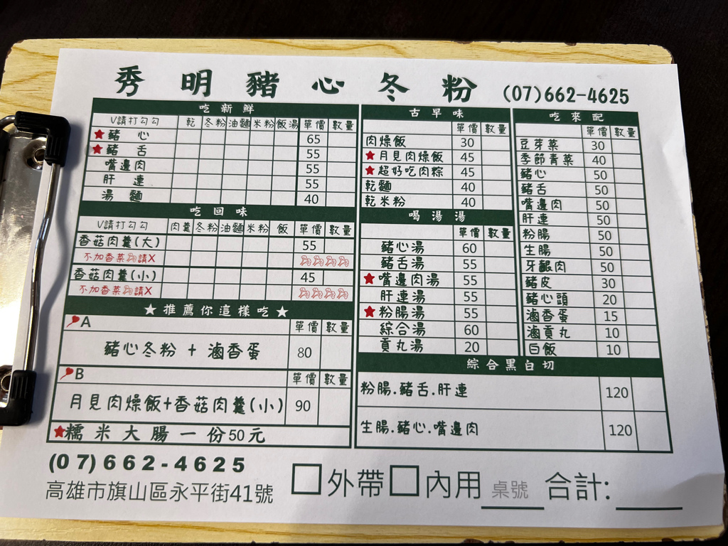 菜單👇👇選擇不算多,但就招牌經典,加上個人首次來旗山,所以就想多吃更多家,所以在秀明點的很節制,不過我覺得他這邊不錯的是選了主食後,可以選不一樣做的作法,有乾/湯/飯 …應有盡有也算是符合每個不同的需求