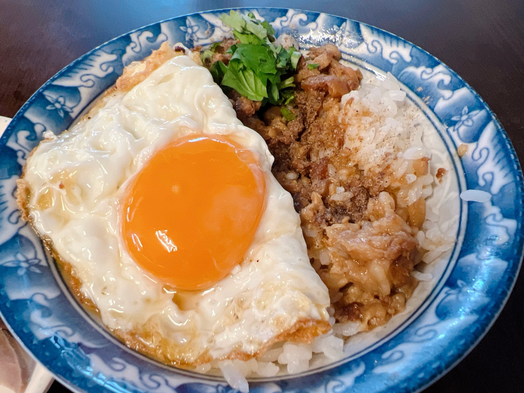 月見肉燥飯(45元)但真心被打動還是這個,看到「月見」就無法克制的點了他,因為就想到半熟蛋黃流至飯裡,怎麼會不好吃,肉燥的口味雖然偏重,但是因為有蛋黃的融合,所以滑順順口的包覆著飯,忍不住會一口接一口的完封他,雖然飯很容易飽,但還是忍不住的點了他,事實證明沒錯啦!超愛弄破蛋黃流出來的那一刻,看了超級療癒